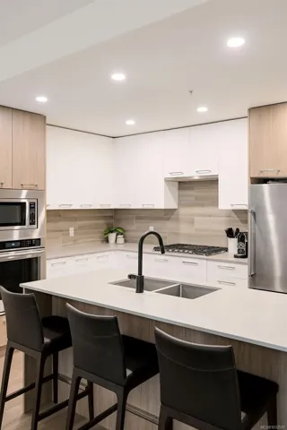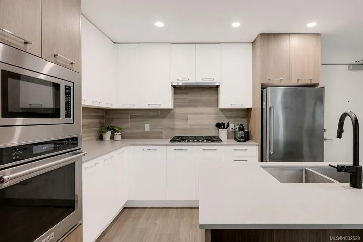 Inside, the floor plan features 2 bedrooms + a den that comfortably works as a 3rd bedroom or office, two full bathrooms, & a generously sized laundry room with excellent storage. Beautifully finished throughout, stainless steel appliance package, gas cooktop, quartz countertops & contemporary cabinetry.