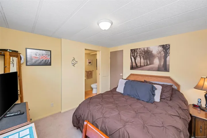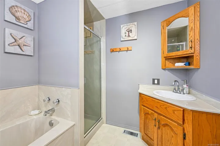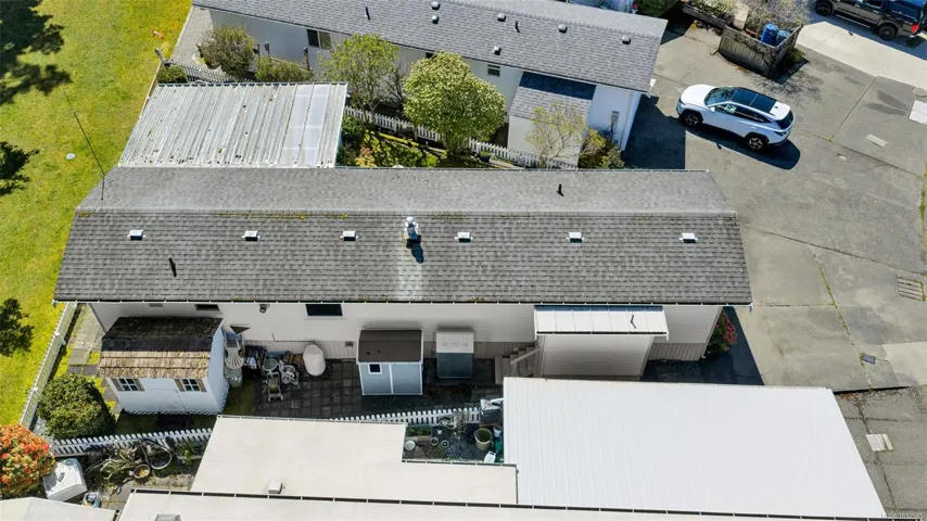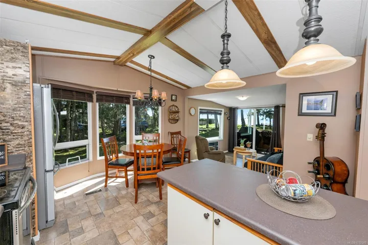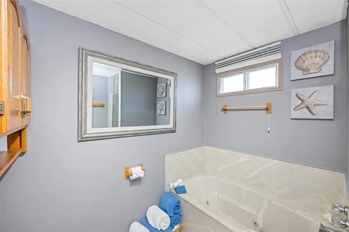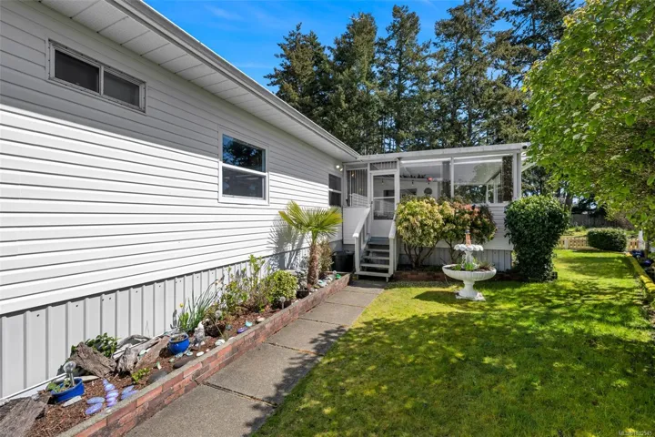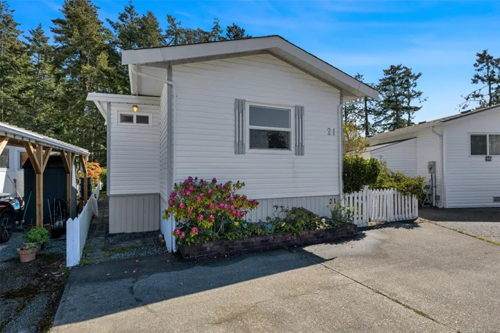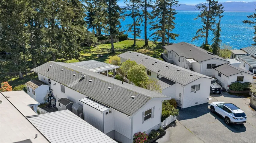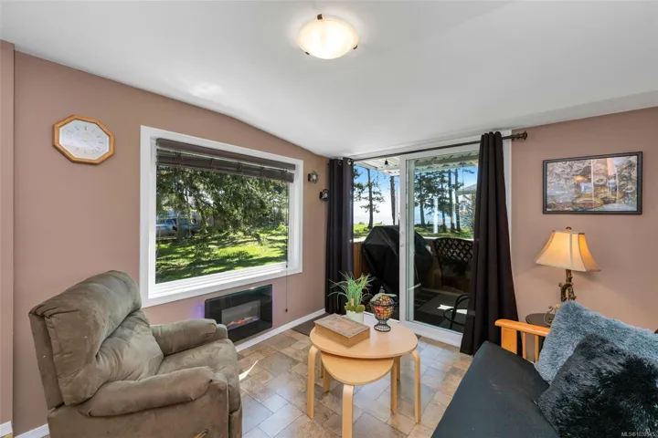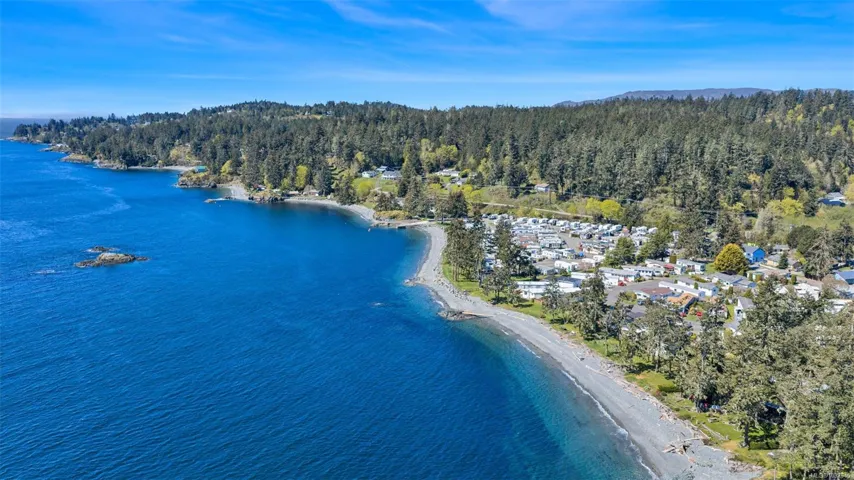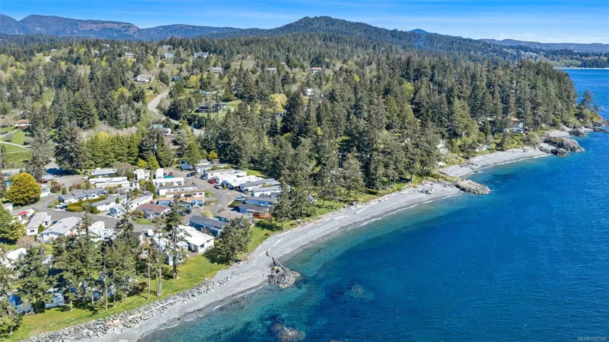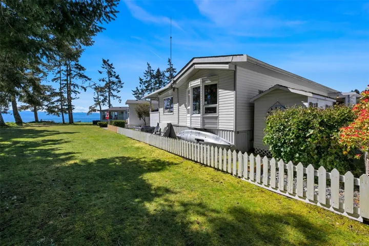 Experience true West Coast living with walk-on beach access just steps away. Relax in the hot tub under the stars or entertain friends and family on the enclosed deck with ocean views. The fully fenced yard features mature landscaping and a convenient storage shed. Inside, the open-concept kitchen and dining area overlook a cozy living space with serene green space and beachside outlooks. The main bedroom includes a private 2-piece ensuite, while the main bathroom offers a jetted tub and separate shower. A second bedroom with bunk beds and an in-unit laundry area complete the layout. This single-wide home with addition and enclosed deck feels surprisingly spacious. Located in a rare manufactured home strata with underground services, shared septic, RV/boat parking, and nearby dock access for added lifestyle appeal. Bus at your doorway.