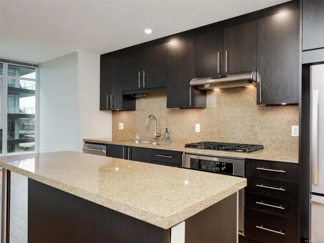 Welcome to Balance at Dockside Green—one of Victoria’s most desirable waterfront communities. This 7th floor 1 bed, 1 bath condo offers 608 sqft of thoughtfully designed living space with bamboo floors and views of the Victoria Harbour. Floor-to-ceiling windows fill the home with natural light, while the open kitchen features granite countertops, stainless appliances, and a gas range. Extensive updates include a new dishwasher, new washer/dryer, new closet doors, new carpet in the bedroom, and new ceiling light fixtures, making this home truly move-in ready. Enjoy secure parking, storage, Pet Friendly Bylaws and a LEED Platinum building focused on sustainability. Bike storage makes it easy to access the Galloping Goose and scenic harbour pathways just outside your door. All this just steps to cafés, shopping, waterfront trails, and an easy walk to downtown Victoria. Exceptional value in a world-class waterfront community.