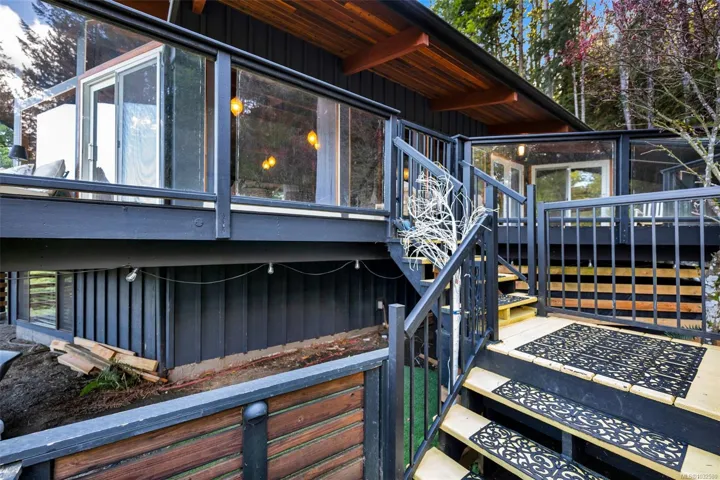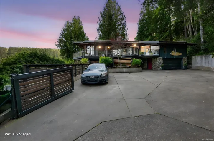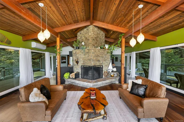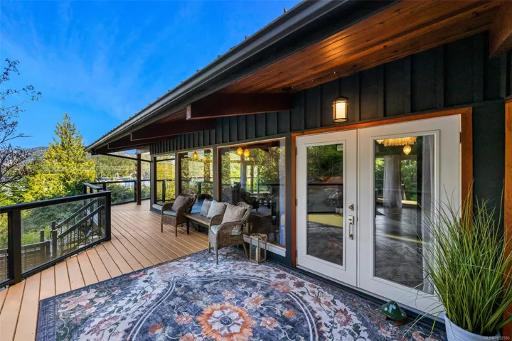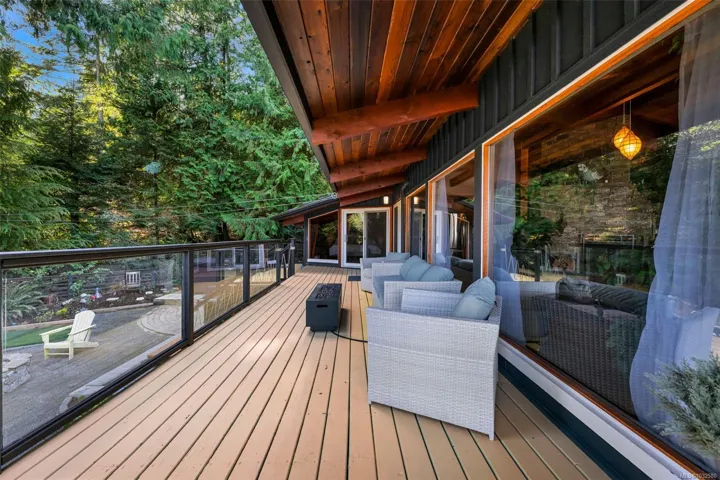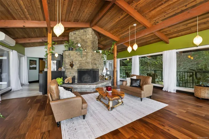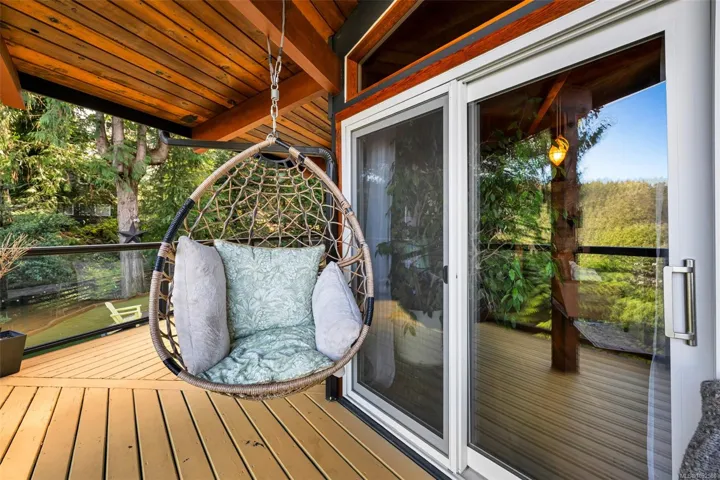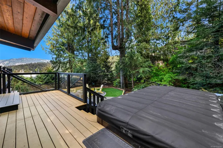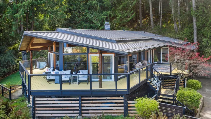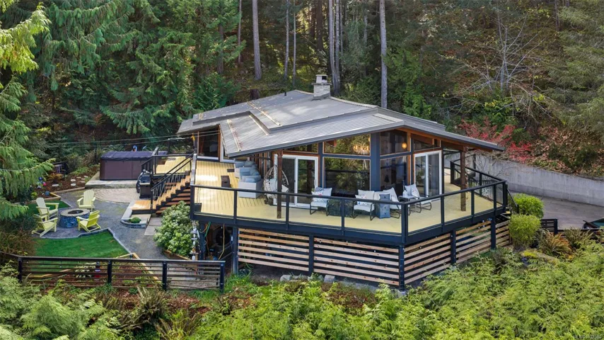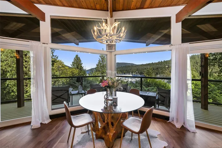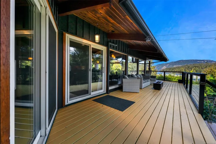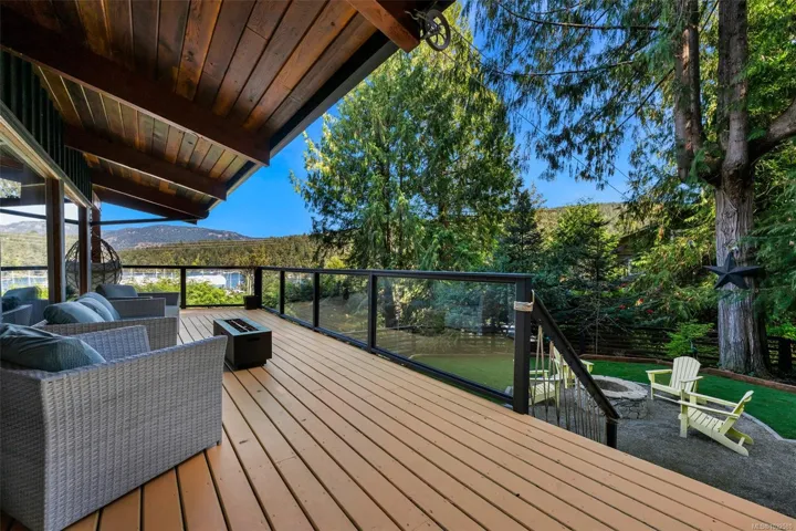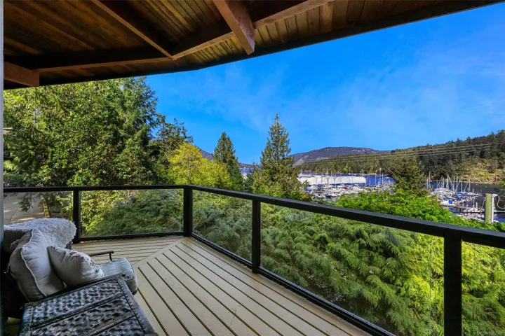 Nestled into the hillside on a private 0.62 acre lot across from, & with views of Maple Bay marina is this gorgeous 2800 sqft., 4 bedroom, 3 bathroom, West Coast home set up perfectly for entertaining with a new wet bar, over 1000 sqft. of deck space, a 12 person swim spa & a new patio area with firepit & quality artificial turf! The main level has beautiful wood beams, vaulted ceiling, new acacia wood flooring, solid fir doors throughout, beautiful stone fireplace, updated kitchen, updated lighting, fresh paint & impressive floor to ceiling windows in the living/dining area to take in your natural surroundings. Two bedrooms on the main level including the spacious primary with deck access, 5 pce ensuite & walk-in closet. Downstairs is a wonderful family room with new bar, 2 more bedrooms, a full bath, laundry room & garage access. Highlights include a heat pump, gated & fenced yard, lots of parking, small seasonal waterfall & a premier location for boaters & outdoor enthusiasts!