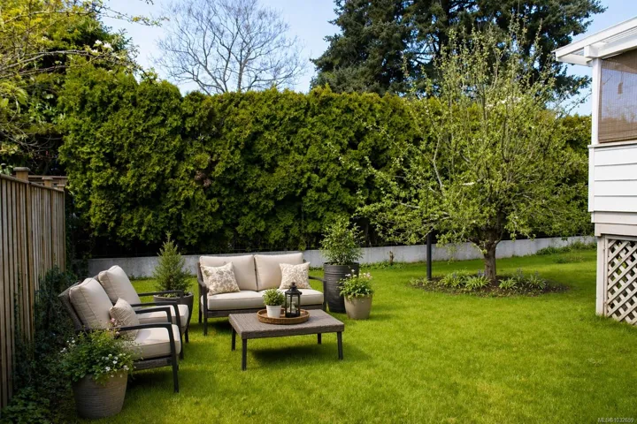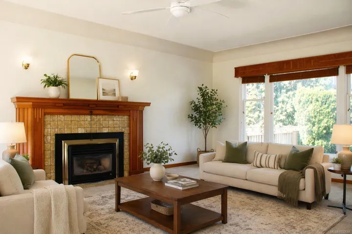 Charming post-war home (circa 1947) in Nanaimo’s sought-after Brechin neighbourhood, just one block from the waterfront Promenade. This 2-bedroom home showcases original character throughout, including inlaid hardwood floors (under carpet), cove ceilings, classic wood trim, and interior leaded glass doors.The spacious living room is filled with natural light from oversized windows and features a beautiful Art Deco gas fireplace, complemented by vintage wall sconces and preserved cove ceilings. French doors lead to the dining room, with hardwood flooring continuing beneath the
