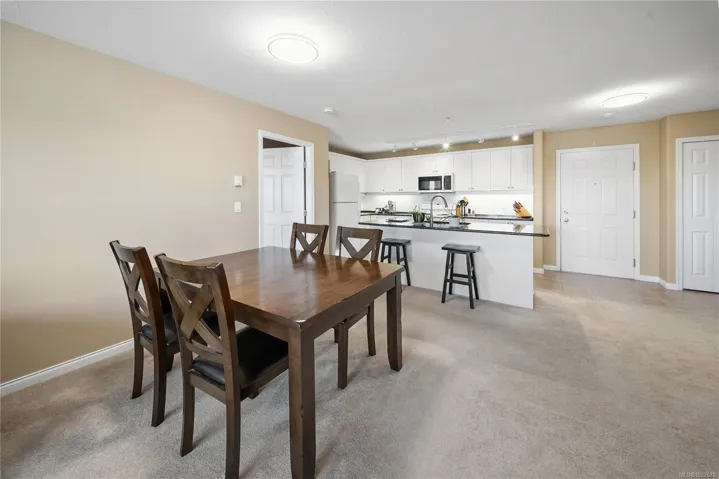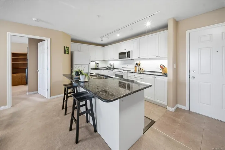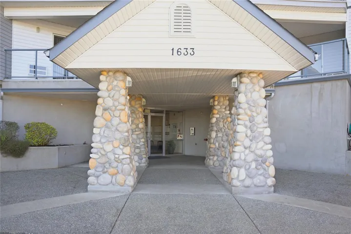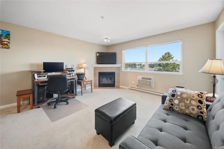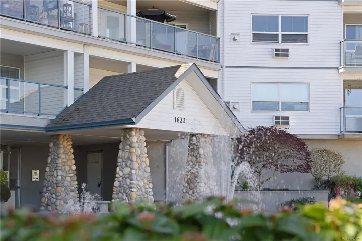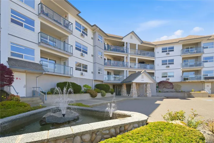 Sharply priced and beautifully maintained, this 2-bedroom, 2-bathroom condominium in The Fountains offers over 1,100 sq ft of bright, well-designed living space. The open-concept layout features a spacious kitchen with a large island, quality appliances, and seamless flow into the living and dining areas. Bedrooms are thoughtfully separated, including a generous primary suite with a private ensuite. Enjoy mountain views and distant ocean glimpses from the covered balcony, along with abundant natural light through expansive windows. Additional highlights include in-suite laundry, a cozy gas fireplace, an air conditioning unit, secure underground parking, and a large storage locker. Centrally located in Nanaimo, just steps to shopping, dining, recreation, and the hospital, this well-managed building offers excellent amenities and a welcoming community. All measurements are approximate.