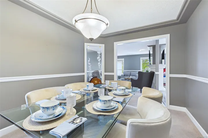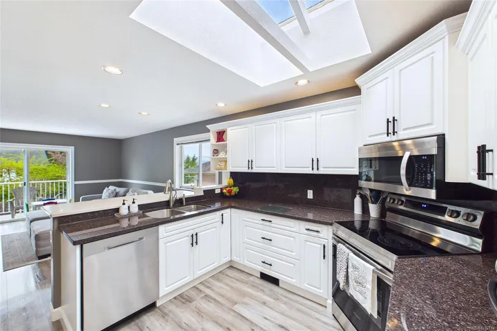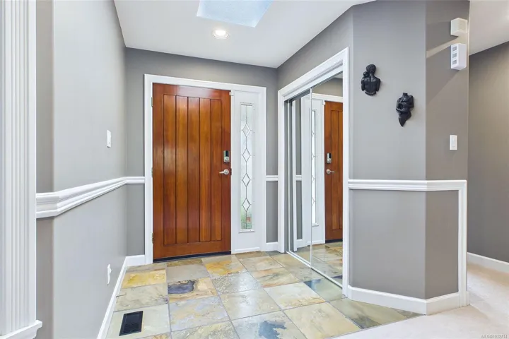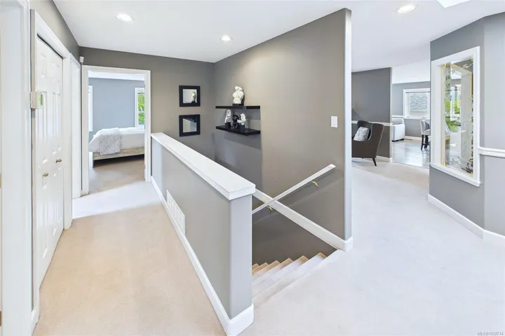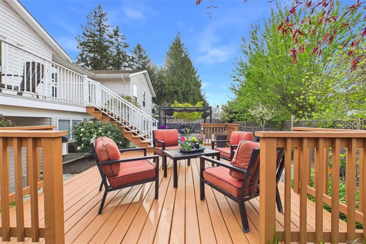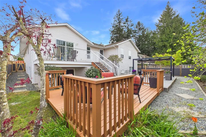 Immaculate Level Entry/Walk out Lower-level home. Located in one of North Nanaimo’s most ideal neighbourhoods, this large 3385 sqft home offers 5 bedrooms + Den along with suite potential. The lower level is highlighted by the theatre room, wet bar kitchen, games area, custom built in shelving, 2 lge bedrooms & direct access to the low maintenance rear yard. On the Upper Level; enjoy ocean views from the remodeled kitchen which includes granite counter tops, Custom Cabinetry, 2 way gas fireplace w/ rock accents, 3 bdrms incl large 15×12 primary bdrm, walk in closet & 3 piece ensuite. The upper family room offers access onto the balcony w/ stairs leading to the rear yard. Additional features include heat pump, full irrigation system & over sized 20×23 double car garage. This extremely well cared for home is on a no thru street within close walking distance to both McGirr Elementary & Dover Bay High. The quintessential neighbourhood! All measurements are approx. Pls verify if important.