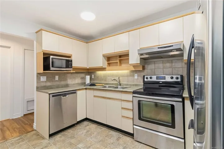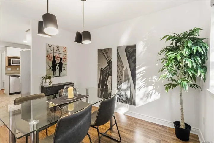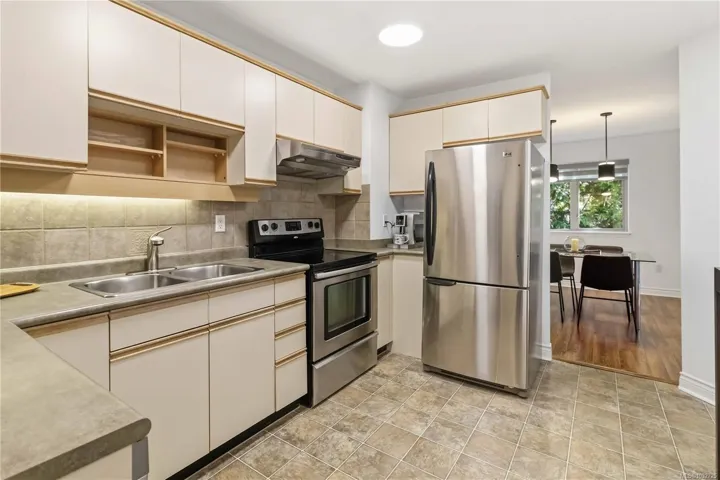 Welcome to this exceptional two-bed condo where space, light & location come together beautifully. Offering over 1,000 sq ft of thoughtfully designed living space on the quiet SW corner, this suite enjoys peaceful outlooks & privacy. Expansive windows fill the living & dining area with light, while a charming wood-burning fireplace adds warmth. Sliding doors open to a large balcony, perfect for morning coffee or evening unwinding. The spacious kitchen connects effortlessly to the dining area, creating a functional, inviting layout. The oversized primary bedroom is a true retreat with a walk-through closet, bonus vanity sink & convenient access to the main bath. A second bedroom offers flexibility for guests or a home office. The suite includes in-suite laundry with extra storage, while the professionally managed, pet-friendly building offers secure underground parking, storage locker, bike storage & guest accommodations. All just minutes from Fernwood Village, DT & the Inner Harbour.