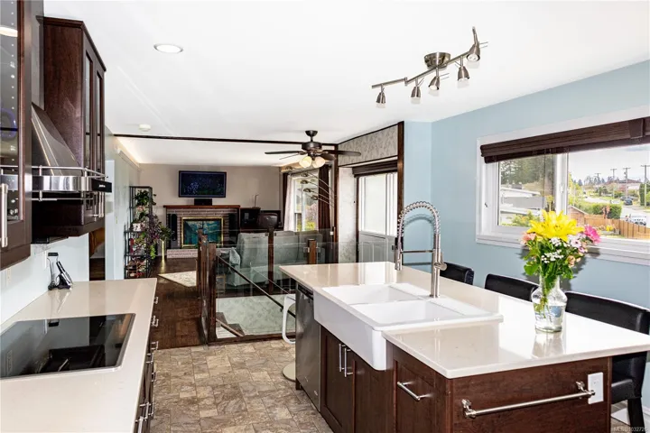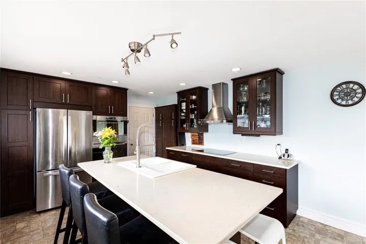 appliances, creating a stylish and functional space for cooking and entertaining around the huge island. The lower