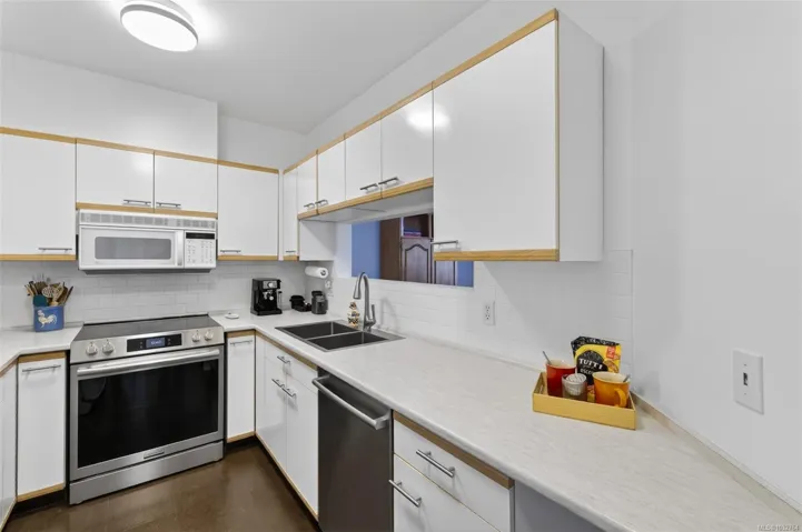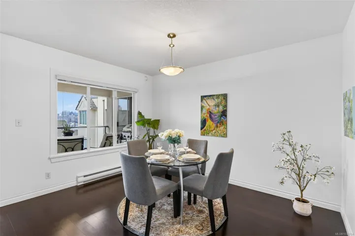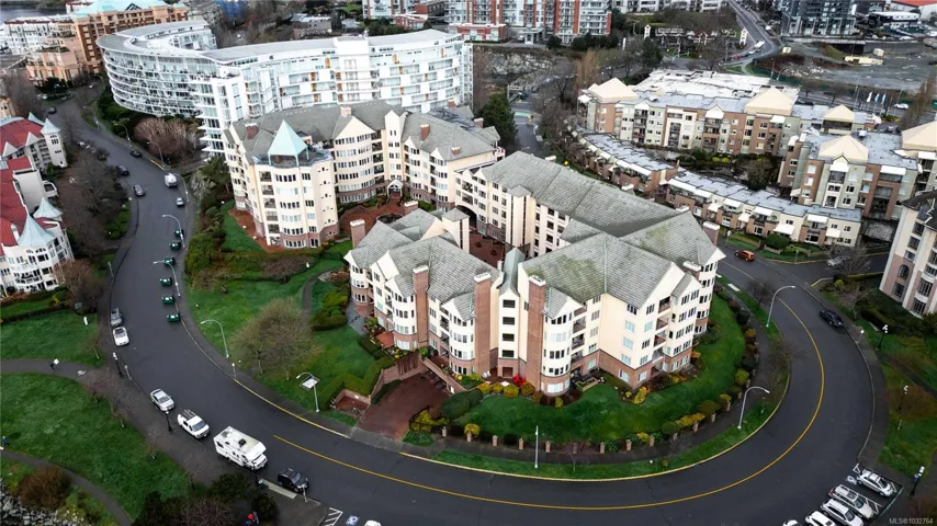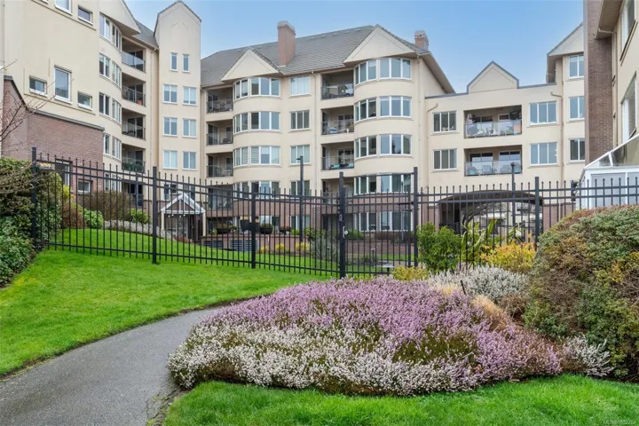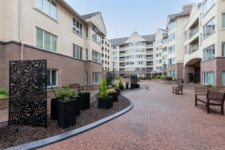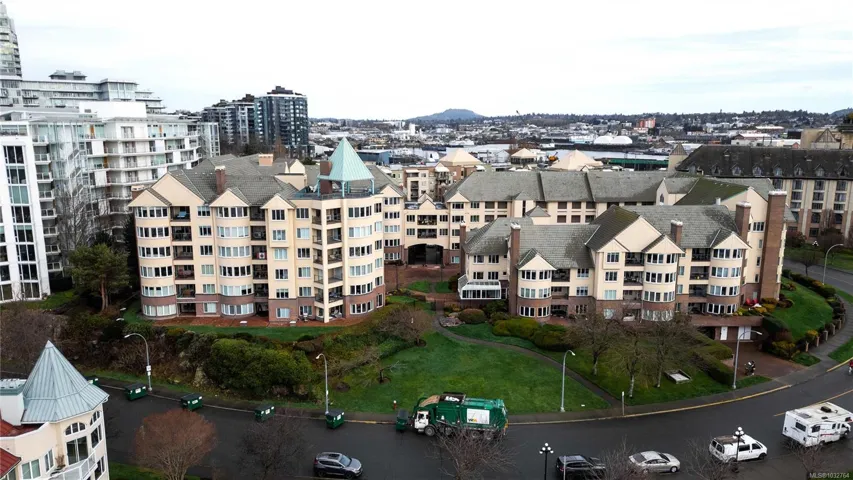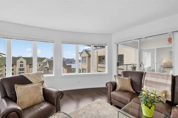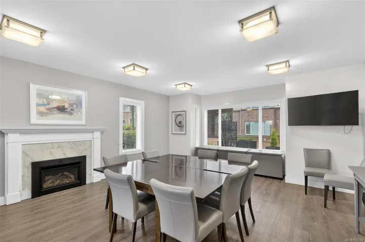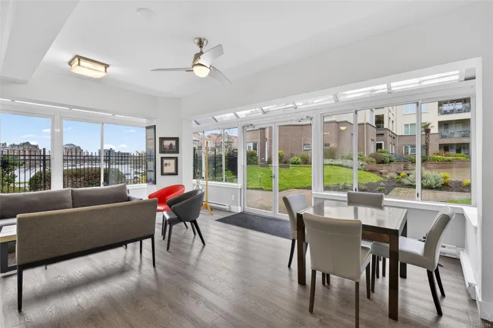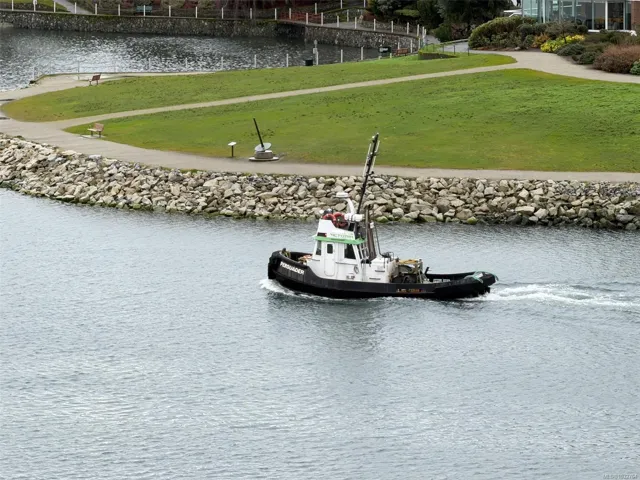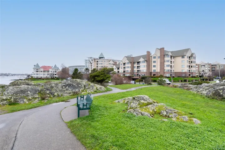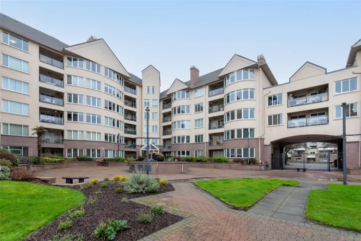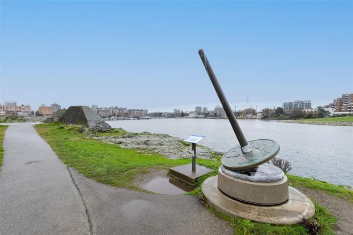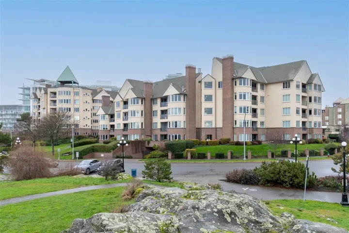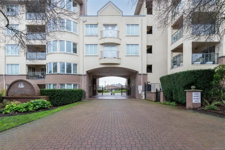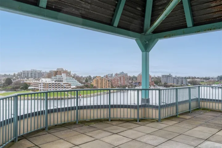 Quiet central Victoria condo with sea breezes & one of five top floor suites with access to a spectacular rooftop deck. This spacious 2-bed, 2-bath condo offers over 1,400 sq ft of light-filled living with high ceilings, a gas fireplace, & a private balcony where BBQs are allowed. Open layout with kitchen flowing into the living & dining areas. The primary suite features a full ensuite, while the second bedroom enjoys water views. Recent updates include hardwood flooring, refreshed bathrooms, & a new front door. In-suite laundry, plenty of storage, a separate locker, & bike/kayak storage in secure parking. Shared amenities include a lounge, meeting room, guest suite, indoor car wash. Gated & fenced community with a large courtyard & a Harbour Lounge where Happy Hours and Poker nights are held. Located just a 10-minute walk to downtown and steps to the seawall, Boom & Batten, and Spinnakers. With an 85 Walk, Bike, and Transit Score. One dog or cat allowed, check by laws.