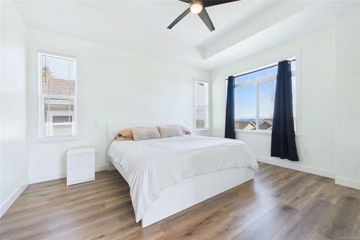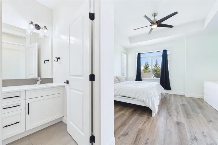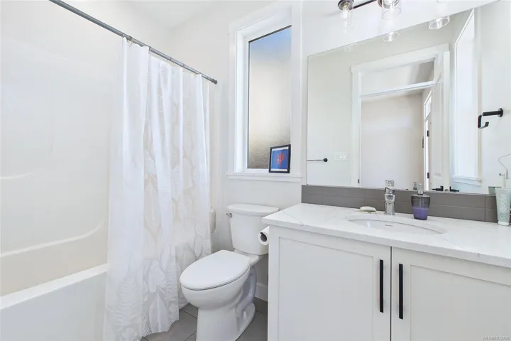 Upstairs, the primary bedroom sits across from the additional bedrooms, ideal for families, with an ensuite featuring heated floors and double sinks. Main bath includes ceramic tile and quartz counters.