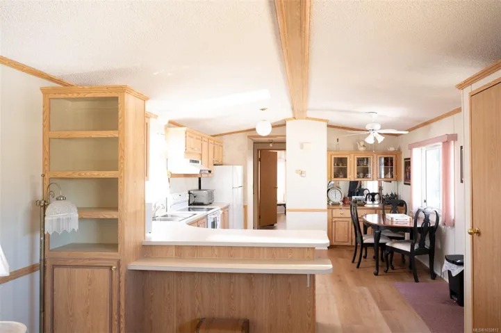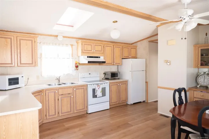 This beautifully cared-for home features two spacious bedrooms and two bathrooms, offering comfort and convenience in every corner. This bright and welcoming kitchen flows seamlessly into the dining area-perfect for daily living or entertaining guests. Vaulted ceilings create an airy, open feel, while the new flooring throughout adds a fresh, modern touch.