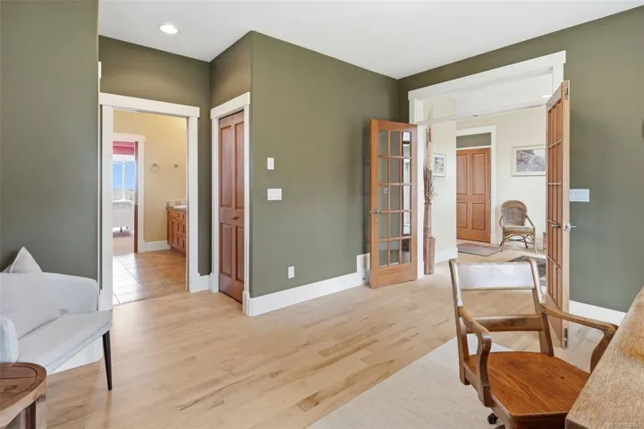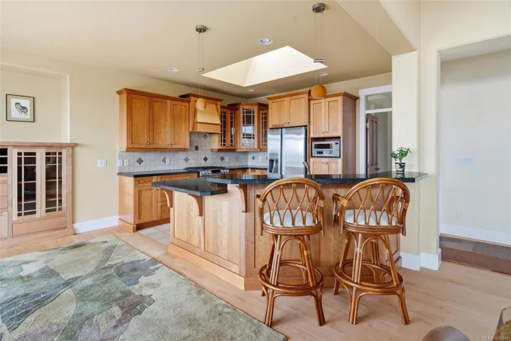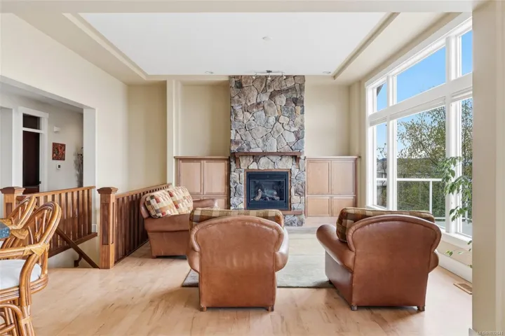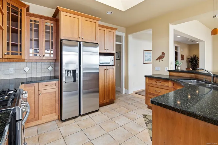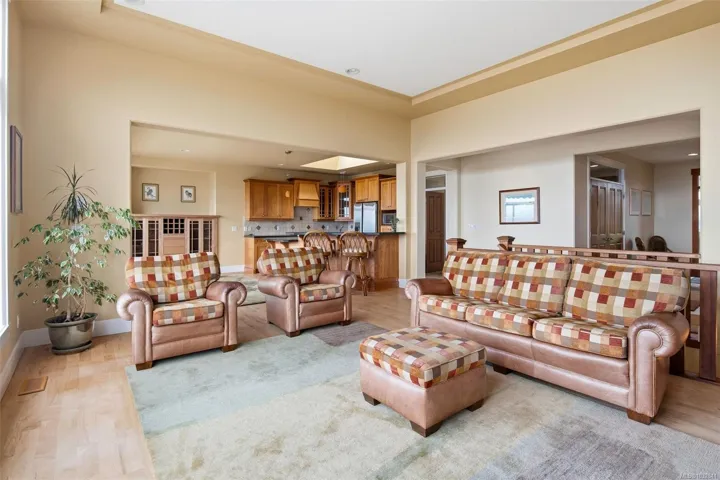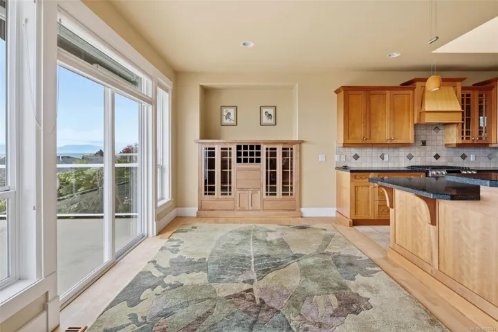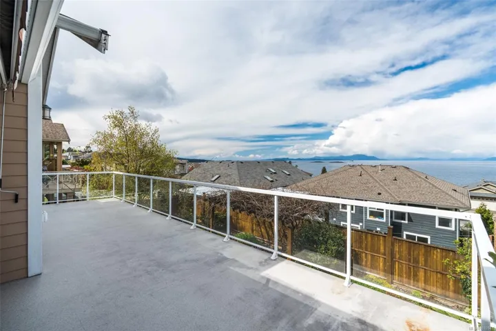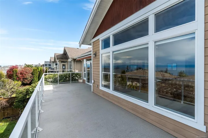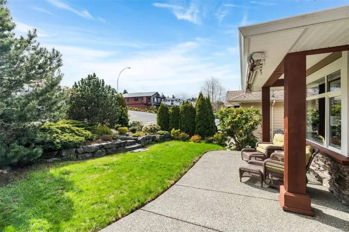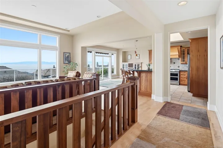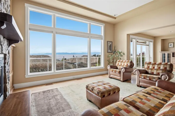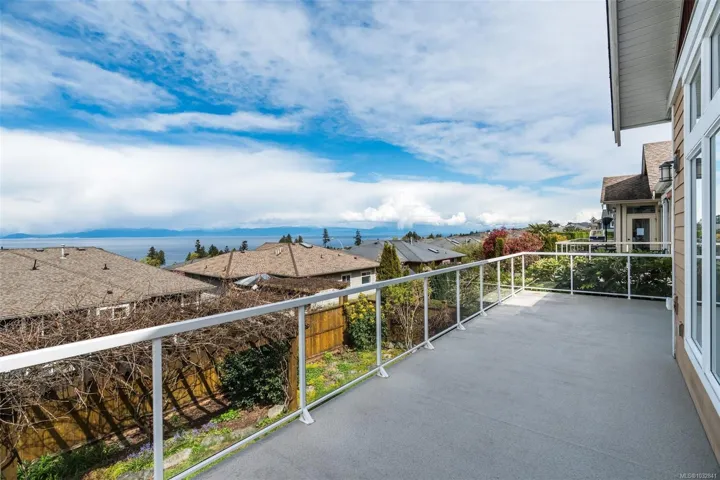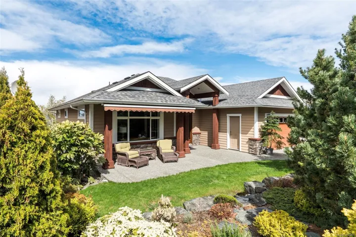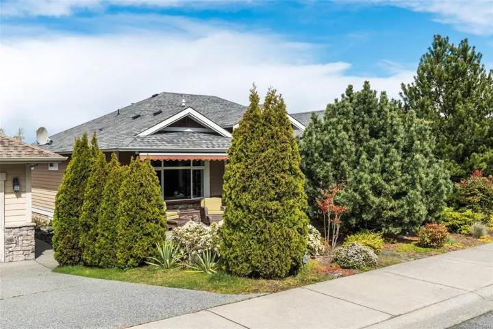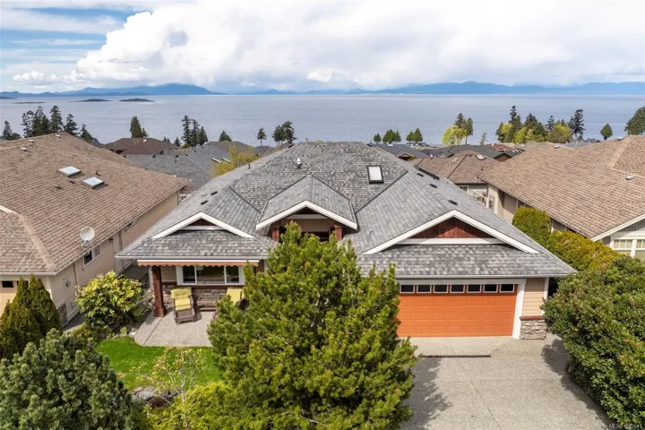 Perched on a quiet cul-de-sac, this custom-built executive rancher is offered for the first time, capturing sweeping panoramic ocean views and a sense of permanence. Thoughtfully designed, the main level unfolds with nearly 10’ ceilings, natural light, and a seamless connection between the great room, dining, and kitchen, creating an atmosphere that feels open yet grounded. Timeless materials—granite, rich wood cabinetry, and hardwood floors—reflect the quality of its construction, while the kitchen remains the heart of the home, oriented to take in both the living space and the view beyond. Just outside, a private patio invites slow mornings and evening sunsets. The generous primary offers a spa-like ensuite and adjoining den or retreat or 2nd bedroom. Below, a walk-out level provides two bedrooms, a full bath, and a large rec space. Surrounded by mature landscaping and moments to beaches, parks, and amenities, this home is defined by its craftsmanship, setting, and livability.