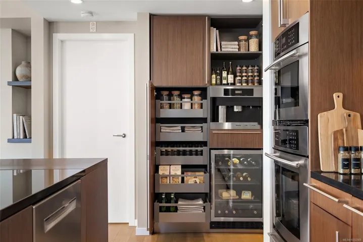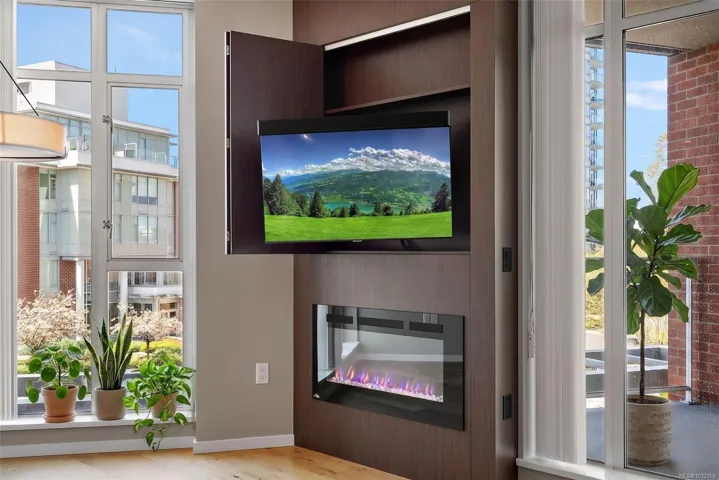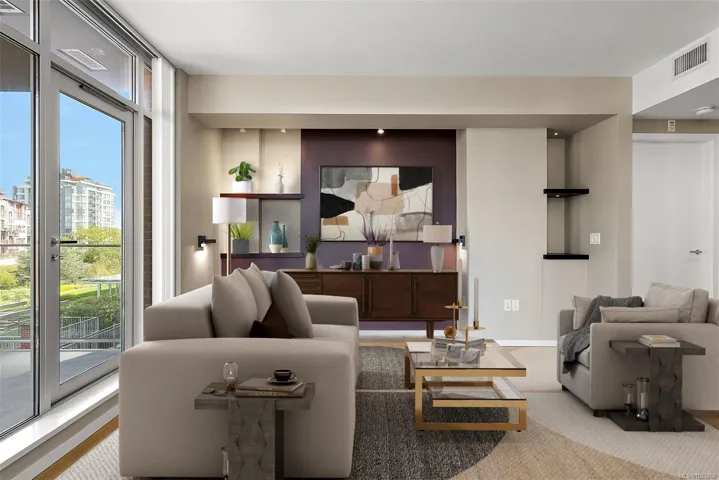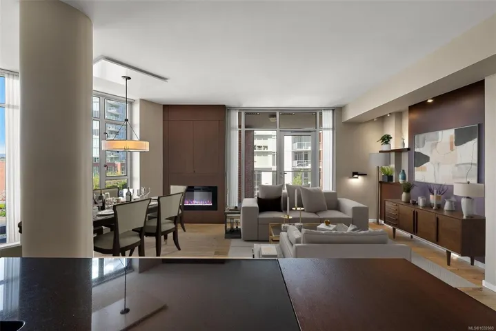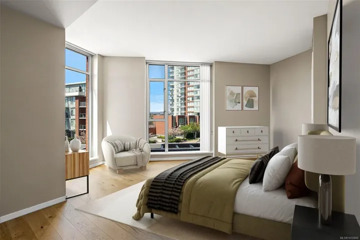Move-in ready! Luxury living at Bayview One on the Victoria waterfront! This immaculate, 2 bed plus den, 3 bath residence offers refined interior living with extensive “Best in the Building” quality upgrades throughout. A well-designed open-concept layout connects living, dining, and kitchen, providing excellent flow for both everyday living & entertaining. Hardwood flooring, custom millwork, & integrated built-in storage elevate the home with a cohesive, finished aesthetic beyond standard building specifications. The kitchen features premium appliances & modern cabinetry. Both bedrooms are well-appointed, with the primary suite offering spa-inspired ensuite comfort & a quiet outlook with glimpses toward the Harbour & surrounding waterfront corridor. Floor-to-ceiling windows bring in natural light & enhance the sense of space throughout. Steps to the Harbour, Songhees waterfront, & downtown amenities, this is true turnkey urban living in one of Victoria’s most sought-after locations.
