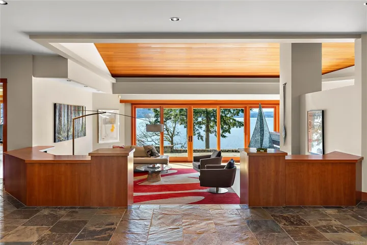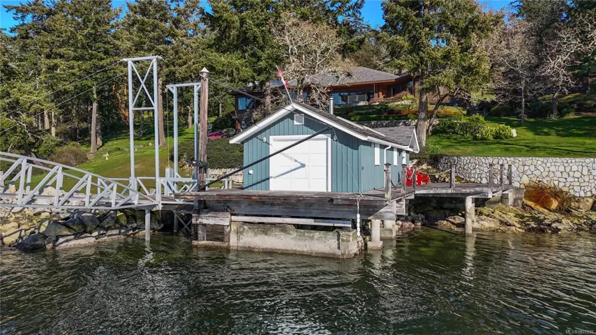 A Masterpiece of West Coast Oceanfront Living. Experience unparalleled exclusivity at this west-facing waterfront estate on the calm waters of the Saanich Inlet. Nestled among Garry oaks and arbutus, this custom-built marvel offers the ultimate maritime lifestyle. A private dock and striking boathouse await your aquatic adventures. Inside, wood-clad vaulted ceilings, oversized skylights, and expansive glass frame magnificent oceanic vistas. The gourmet kitchen and open-concept living spaces flow seamlessly to a stone patio and screened-in patio, perfect for entertaining. Retreat to the primary sanctuary, featuring spa-like ensuites and a private fireplace. With a caretaker cottage, extensive garaging, and a workshop, this sanctuary provides absolute privacy without compromising convenience. Discover your private paradise.