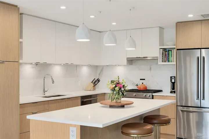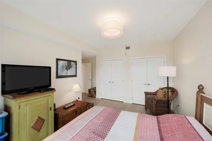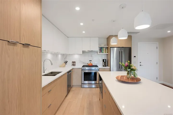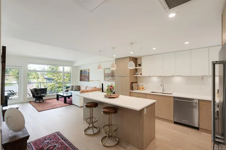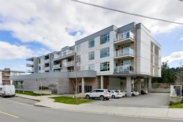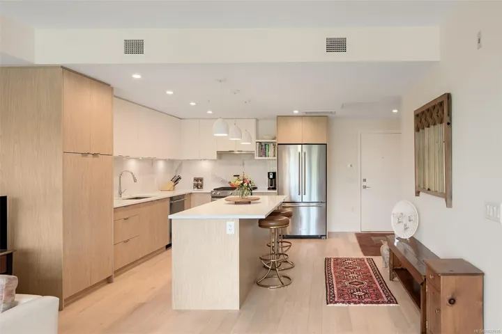 Enjoy seaside living at the Haro in sought after Cordova Bay! This beautiful bright modern 2 bedroom and 2 bathroom condo features high quality finishing throughout, including gorgeous hardwood flooring, an entertainment style kitchen with a large island, gas stove, quartz counters, stainless steel appliances, electric blinds, and heated tile flooring in the bathrooms. The spacious balcony off the living room offers lovely ocean views and room to relax or BBQ. There’s secure underground parking with an EV charger, separate storage, and bike storage. The complex offers great amenities, including Anytime Fitness, a sushi restaurant, an Italian deli and more! Just steps to the beach, Lochside trail, Doumac Park Forest, and a short walk to Matticks Farm and Cordova Bay Golf Course. Plus, an easy commute to downtown, the ferries, and the airport.