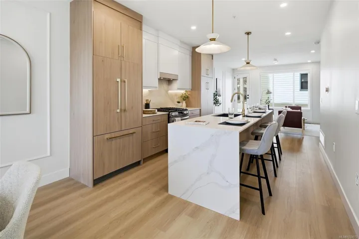 Welcome to this Custom, modern, luxury West Coast Stunner. Built by award-winning, builder Leno Developments Inc. This home has it all, starting with a real natural stone exterior, wood soffits, wood tone metal and a mesmerizing driveway. This home boasts outdoor firepits, dedicated hot tub connections in your backyard, with a gorgeous covered patio. Main level features custom-built cabinets throughout. wood slat shelving, quartz waterfall island. Rare access to your front patio and rear yard from the same floor. This green home was built to step Code 4, reducing your utility bills. These homes have 2 heating sources with an efficient heat pump and gas furnace as backup, with centralized AC. Upstairs host 3 spacious bedrooms with 11-foot ceiling height for primary and secondary bedrooms. The primary bedroom has custom his and her closets, a spa inspired shower. Ground level has option for in law suite, all above ground with windows for 4th bedroom and a side entrance for easy access.