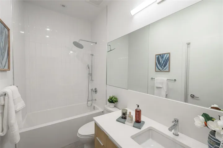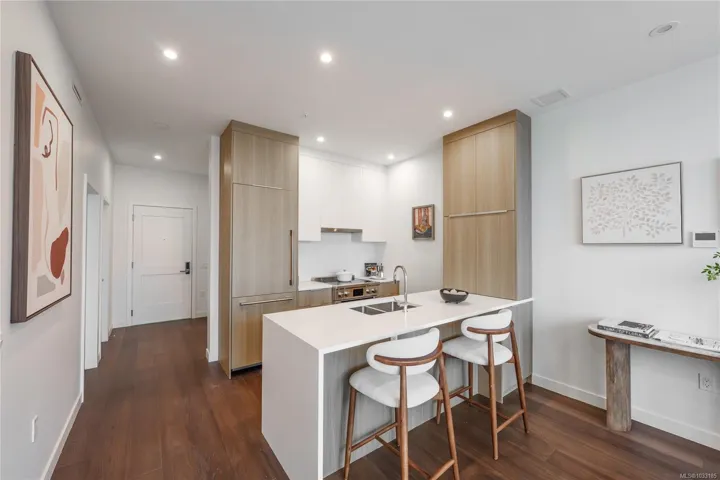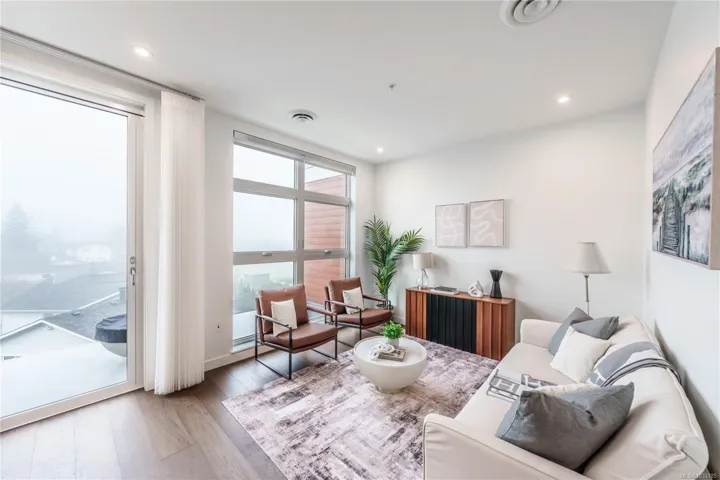 Welcome to Unit 307 at The Rise on Fifth, a beautiful west-facing home where you can enjoy captivating sunsets & tranquil mountain views. This elegant residence boasts a bright, open-concept layout with a gourmet kitchen featuring quartz waterfall countertops and a premium built-in Fisher & Paykel appliance package, perfect for both everyday living & entertaining. Relax on your private patio, ideal for morning coffee or unwinding after a long day. The spa-inspired bathrooms impress with floating vanities, sleek tiled walk-in showers, and a deep soaker tub for ultimate comfort. Additional conveniences include energy-efficient heating and cooling, smart home automation, secure underground Klaus parking is included, storage lockers, bike storage and a pet washing station. Take in peaceful Haro Strait views from the rooftop patio or enjoy a short stroll to the beach & vibrant Sidney downtown. Experience refined luxury and effortless living in this exceptional home.