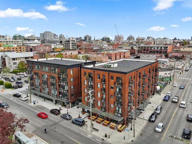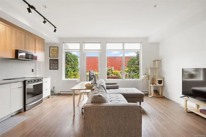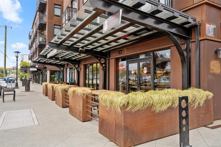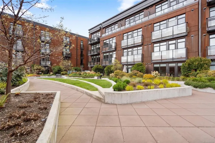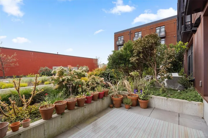 This south-facing terrace residence at The Ironworks is filled with natural light and offers a rare combination of indoor comfort and functional outdoor space. One of only a small number of terrace suites in the building, it includes an outdoor area with room to sit, dine, garden, and enjoy the sun. Inside, the home features a contemporary plan with over nine foot ceilings, quartz countertops, ceramic tile backsplash, over nine foot ceilings, attractive flooring, good kitchen storage, and in-suite laundry. The building is notably pet friendly and permits two dogs or cats. Secure underground parking, separate bike storage, and landscaped common areas are included. Set on Chatham Street near Old Town, Chinatown, Market Square, and Lower Johnson, this highly walkable part of downtown Victoria places restaurants, cafés, shops, and the waterfront close at hand, while the home itself offers an uncommon amount of sunny outdoor living space for the area.