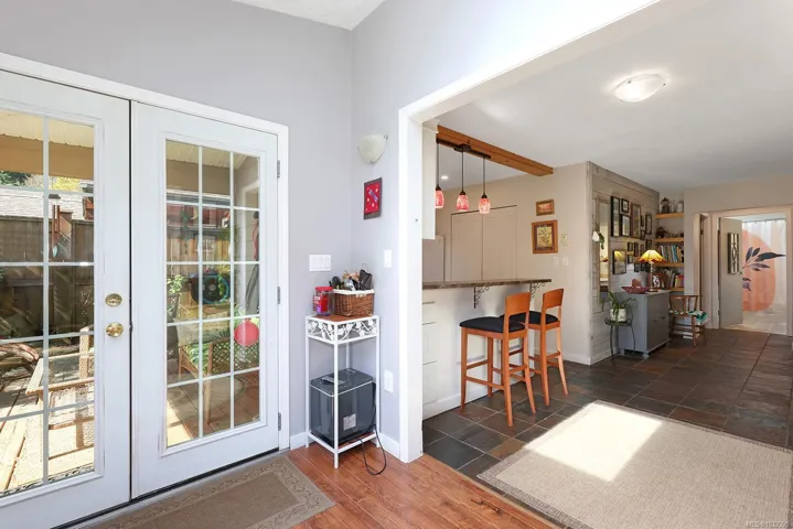 Old Orchard half duplex! Enchanting and simply adorable, streaming sunlight illuminates the sunroom w/ skylight and French doors to access the covered patio. Boasting 909 sf, 2 BD/ 1 BA, this home has been beautifully updated and renovated over the years, bright white modern kitchen w/ shaker cabinets and raised bar with seating, a large pantry closet with stacking washer/dryer. Slate tile flooring, Acacia hardwood flooring, West Coast inspired shiplap and exposed wood beam and open shelves create a comfortable space to entertain friends or enjoy the peaceful serenity of the tranquil gardens. Nestled in a private, fenced yard with access off 1st St, an easement on title allowing this owner direct access to this unit. Old Orchard, Courtenay’s heritage neighbourhood created in 1892, is a desirable location only 1-2 blocks from all the amenities – shopping, restaurants, pubs, and trails by the river. Split pump for A/C, murphy bed, new gutters, roof 7-8 yrs, Hardie 3 yrs.