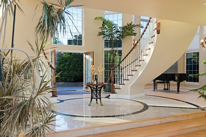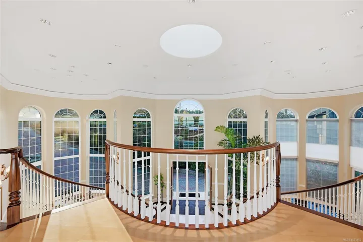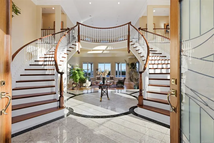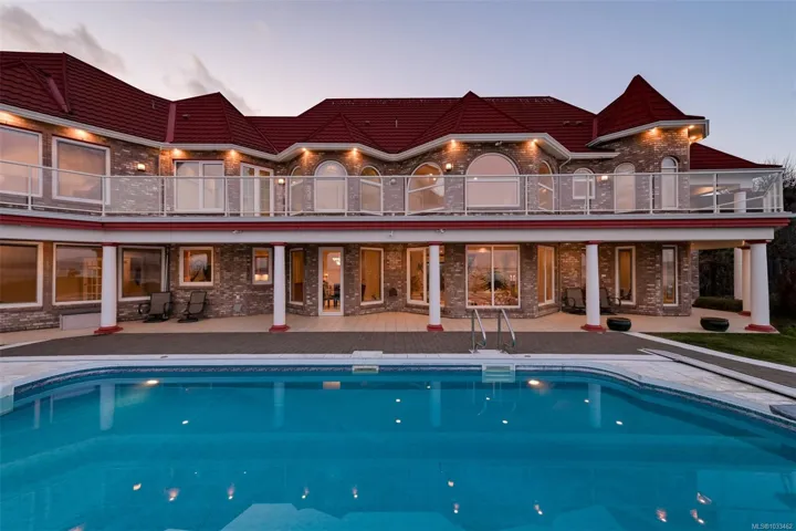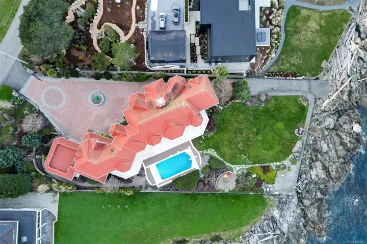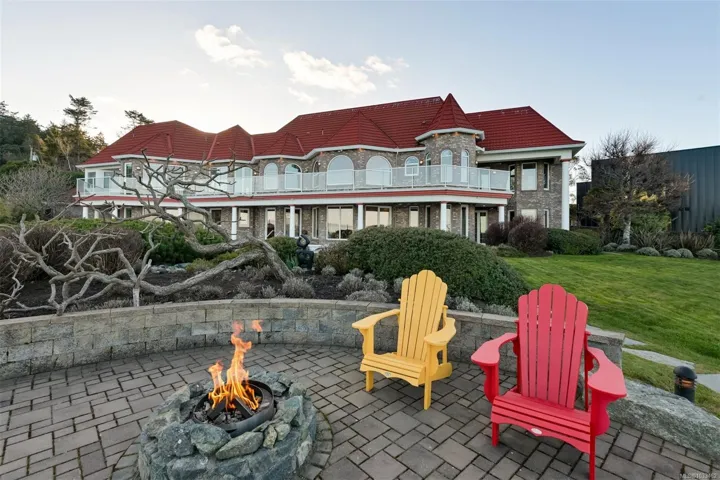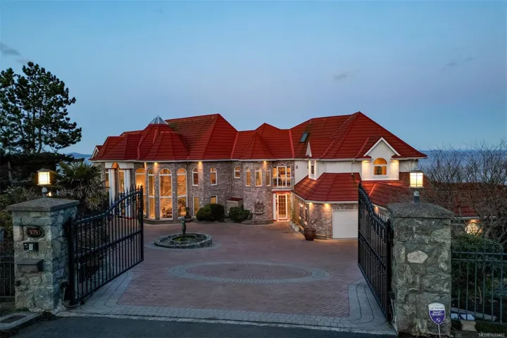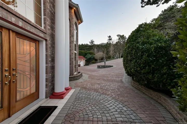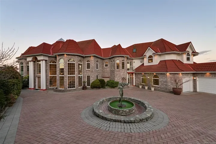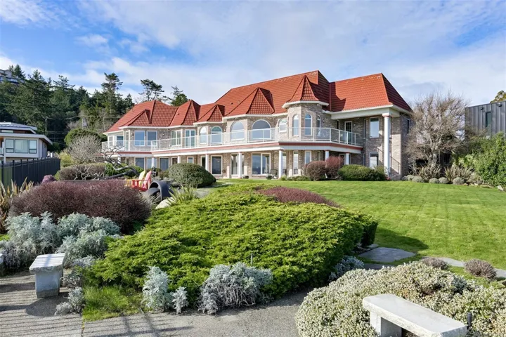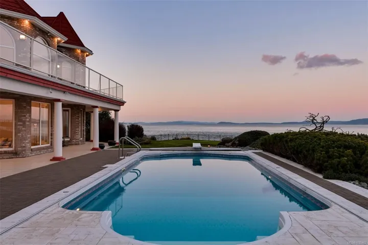 Now Priced 10% BELOW Assessed Value! Quiet, solid bedrock, oceanfront with no bank-erosion concerns & no public beach influence. No through street. Additional boulevard parking. Fully deer-fenced! Almost 6600 SF of living space + massive garage area comprises another 1000+ SF; truly a car-enthusiast’s dream. Exquisite Foyer, Piano Conservatory, formal DR & LR with 21-ft ceilings, surrounded in windows with a circular rotunda dome in the center of it all. 5 BRs, each with full ensuite. Library/Study up + unique office on main. FR right off pool deck. Media Room at the opposite end of the residence. Panoramic views over Salish Sea with ice capped Mt Baker & the Cascades Range front & centered in your outlook. Designed to perfectly sprawl over this .83-acre property while taking the most advantage of the view from each room. So close to the U-Vic. Telegraph Cove Beach, just a stroll from your front door, where you can enjoy the sand. Cadboro Bay Beach & Village is about a 15-min walk.