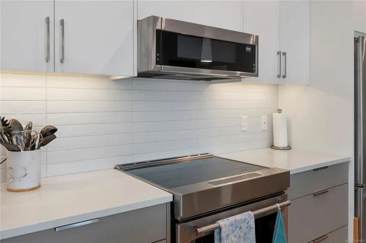 The Best of Coastal Living! Experience contemporary, ocean-view luxury in this rare corner-end unit offering a large patio area. If you’ve been searching for a residence where the view is matched only by the outdoor living space, your search ends here. There is a massive, partially covered patio (approx. 18’x26’). unique to this floor, where you’ll enjoy a private, wrap-around garden and a sleek opaque glass divider for maximum privacy. Inside, this 2-bedroom, 2-bathroom sanctuary feels brand new with modern elegance and high end finishings, and plenty of natural light. The kitchen offers stone countertops, plenty of cabinets and just off the kitchen is a multi use space functioning as a butlers pantry, office and extra storage. Stunning views can be enjoyed from the living area and primary bedroom. This building provides a gym, bike storage, underground parking, storage locker, and a large outdoor common area, and is mere steps from the Sea walk. View today!