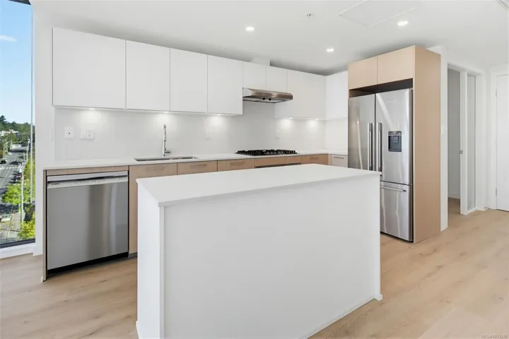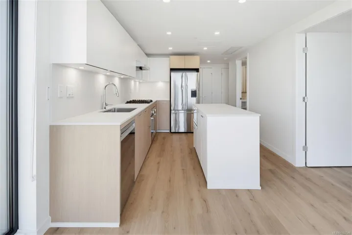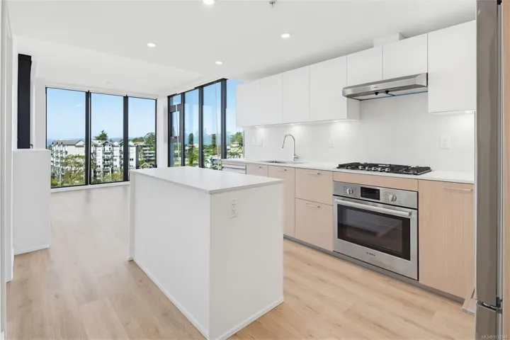 This bright 1 bed + den offers ~646 sq ft with an open layout & private balcony with expansive views of the ocean & Olympic Mountains. The kitchen features a gas range, Fisher & Paykel fridge, quartz counters, island and custom cabinetry.