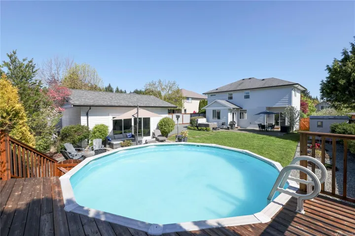 Your dream family home awaits! This beautifully updated residence sits on a .25-acre lot, blending modern comfort with outdoor living. At its heart is a stunning kitchen with new counters, backsplash, stainless steel appliances, & a large island with breakfast bar. The bright breakfast nook, surrounded by corner windows, showcases new vinyl white oak flooring that flows throughout the home. The cozy family room features a built-in unit with a gas fireplace, crown moulding, custom shelving, and a large picture window. A dedicated office provides the perfect work-from-home space, while sliding doors lead to a southwest-facing backyard. This private, sun-filled outdoor retreat includes a new composite deck, hot tub, above-ground heated pool, & a fully fenced yard. A 7-year-old detached flex room with power & water offers endless possibilities.Upstairs, you’ll find four spacious bedrooms, including a primary suite with a walk-in closet & spa-inspired ensuite featuring a tiled glass shower.