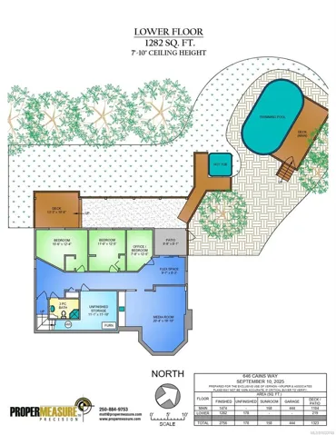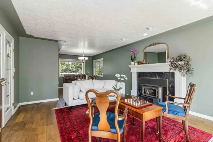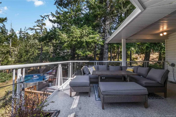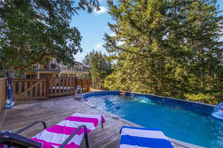WALKOUT RANCHER! A true West Coast retreat! Set atop Mount Matheson, this private 1.26-acre property offers nearly 3,000 sq.ft. of well-designed living with main-level convenience and a versatile walk-out lower floor. The welcoming courtyard entry w/ gardens+fountain leads to bright, updated, open spaces filled with character. The living room is anchored by a wood stove and flows naturally to dining and a refreshed kitchen with quartz counters and breakfast nook, opening to a generous deck with sweeping views of nature. The main-level primary suite includes walk-in closet and ensuite, while a sunroom adds a peaceful flex space. Downstairs, a spacious family/media room with gas fireplace and bar creates the perfect gathering zone, with direct access to the pool and hot tub oasis- so perfect for entertaining! Ideal for families or guests with 5 bedrooms + office/den, plus ample parking and a double garage. This is East Sooke living at its best—quiet, scenic, and endlessly inviting.