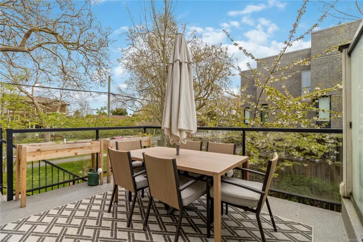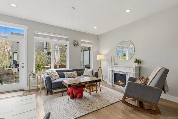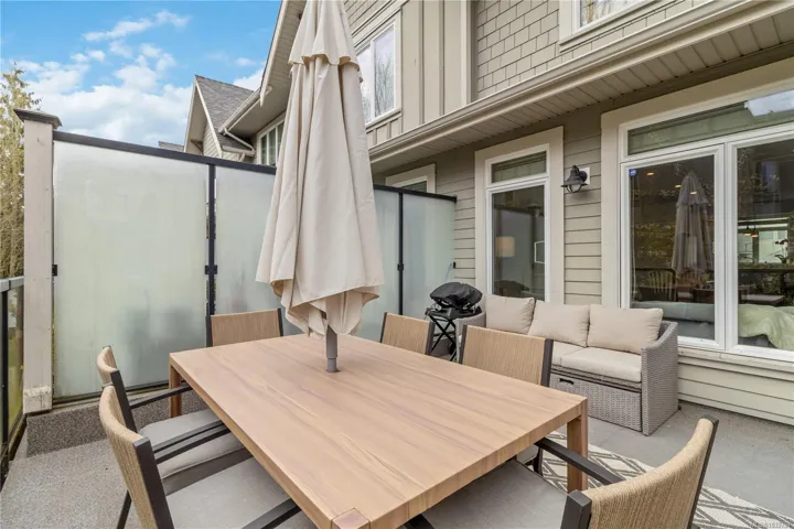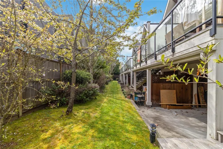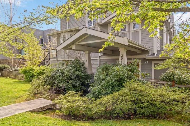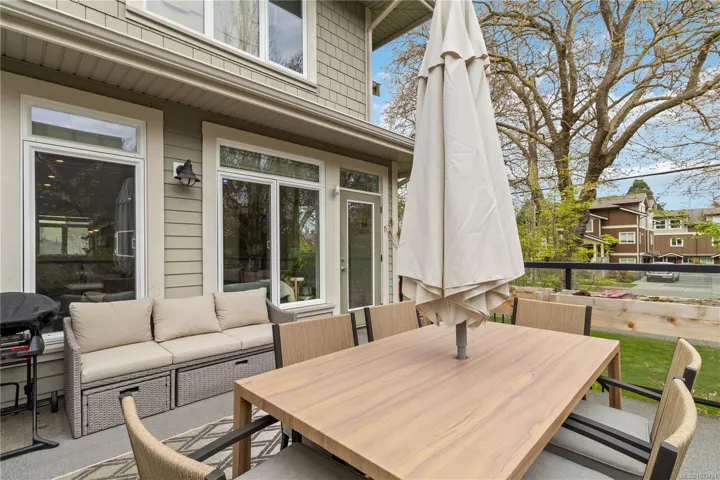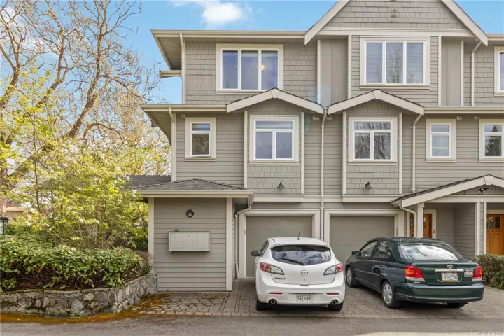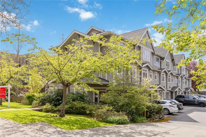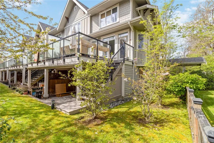 Lansdowne Walk is a boutique collection of 7 Arts & Crafts style townhomes set among mature landscaping & tree lined streets. This desirable end unit enjoys extra surrounding green space, a feature unique to this home. Impeccably maintained, the 3-bed, 3-bath home offers a bright open main floor with 9-ft ceilings, while a bay window & a full wall of extra height windows fill the home with natural light from top to bottom. The kitchen features granite countertops, stainless steel appliances & an eating bar, while the living area opens to a south facing sundeck. Private stairs link the sundeck to the patio below, creating inviting outdoor spaces for relaxing or entertaining. Upstairs, the primary & 2nd bedroom share a full bathroom. The entry level includes a 3rd bed rec room, 4-peice bathroom & access to a covered patio. Ideally located near shopping, schools, Camosun College, UVic, golf and on a bus route, this home offers comfort and convenience in a sought after neighbourhood.