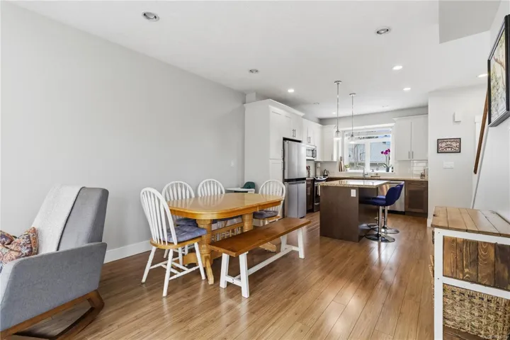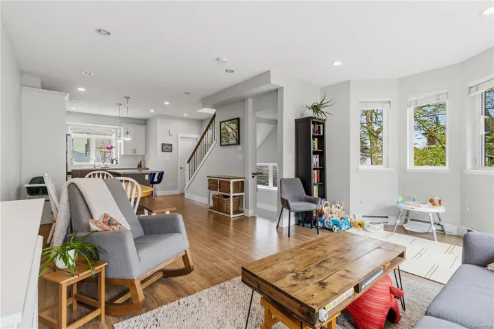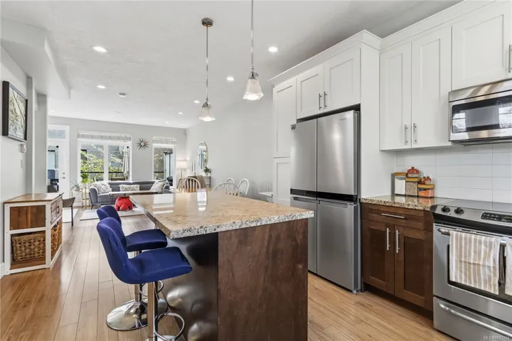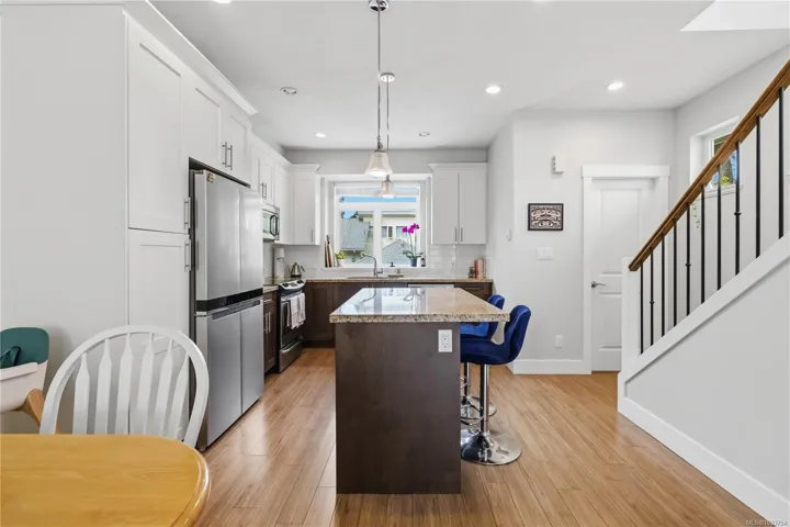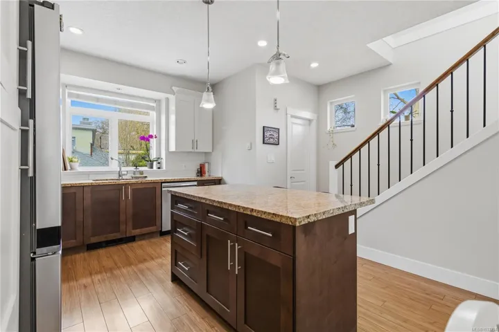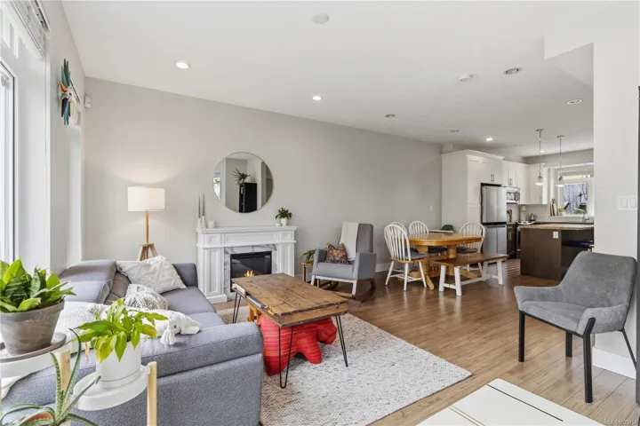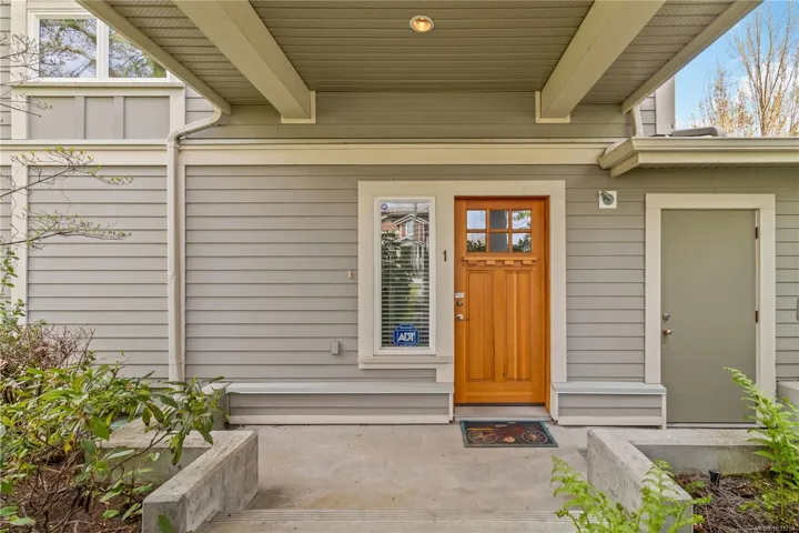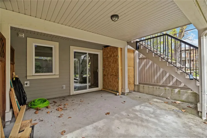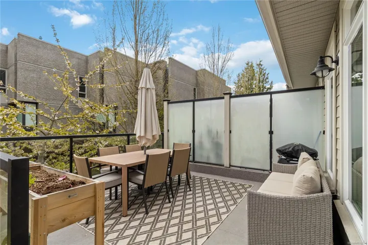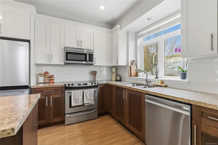 Lansdowne Walk is a boutique collection of 7 Arts & Crafts style townhomes set among mature landscaping & tree lined streets. This desirable end unit enjoys extra surrounding green space, a feature unique to this home. Impeccably maintained, the 3-bed, 3-bath home offers a bright open main floor with 9-ft ceilings, while a bay window & a full wall of extra height windows fill the home with natural light from top to bottom. The kitchen features granite countertops, stainless steel appliances & an eating bar, while the living area opens to a south facing sundeck. Private stairs link the sundeck to the patio below, creating inviting outdoor spaces for relaxing or entertaining. Upstairs, the primary & 2nd bedroom share a full bathroom. The entry level includes a 3rd bed rec room, 4-peice bathroom & access to a covered patio. Ideally located near shopping, schools, Camosun College, UVic, golf and on a bus route, this home offers comfort and convenience in a sought after neighbourhood.